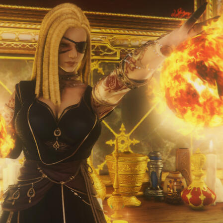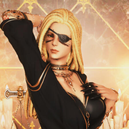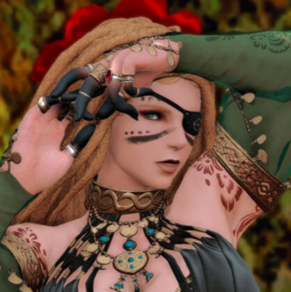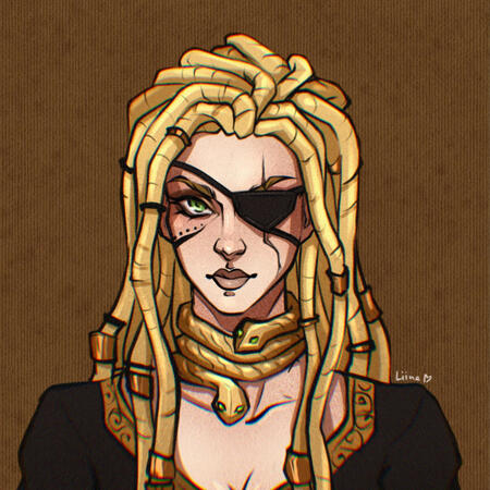A giant of a woman, muscled like a bull, Lavender Almasi stands at six and a half fulms in height with thick arms, legs like tree trunks, and a broad chest. Her skin is pale for a woman born amongst Ul'dah's sands, banded in heavy scarring beneath the expensive silks she favors. The left side of her face possesses a deep furrow that passes from brow to throat, purple, ugly, and twisted; the eye is gone entirely, replaced instead by a massive, polished emerald dredged from one of the family mines. It all but crackles with aetherical energy, though is most often hidden behind well-crafted leather patches. Her surviving eye is a brilliant green, typical of her family, and heavily lined in black kohl. Her hands and arms are painted in rich red-gold henna, the patterns seemingly ever-changing, but themes of flowers, serpents, and unblinking, ever-staring eyes are ever a common thing. Her nails are generally worn long and sharp-pointed, painted in black and gold, and her fingers seem to be forever stained a deep sooty black and sport many jeweled rings. Golden bracelets and anklets appear to be a favorite, their rattling often announcing her entrance into a room, but she seems to forego any earrings as a general rule. She is seldom without the heavy, thick golden necklace that sits rather high on her throat--fashioned in the image of a pair of golden vipers curled about her neck, one sports a left eye is made of a diamond and the right a massive emerald, the other of two identical emeralds. She wears her hair incredibly long, worked into elaborate dreadlocks adorned with trinkets and charms and countless cowry shells that jangle as she walks, reaching to her thighs but frequently worked into a great bun that she binds with a length of bright cloth. Her nose is slightly crooked, her jaw strong, and despite the sheer mass of her build there's yet a lingering, feminine softness to her frame.Carrying herself with all the swagger and sway of someone wholly confident with herself and her place in the world, Lavender still manages to convey a gregarious warmth that borders on motherly. Her voice is husky and often boisterous, her presence commanding, but her smiles come easily and her laughter even easier. A patient woman by nature, she has a mind for business and is slow to rile, though her wrath is a dreadful thing to behold once invoked. She is exceptionally tender towards family and given to adopting those who may lack such as her own. Lavender is rarely far from the company of one or more of her siblings. Her twin, Caedenal, is most often found planted on her left, minding his sister's blind side.